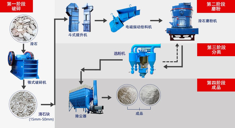 首先,大塊的滑石需要先用顎式破碎機進行破碎處理,破碎后的滑石由斗式提升機送入到儲料倉中;而后電磁振動給料機將料倉中的滑石均勻的給入到雷蒙磨粉機內(nèi)進行磨粉作業(yè);